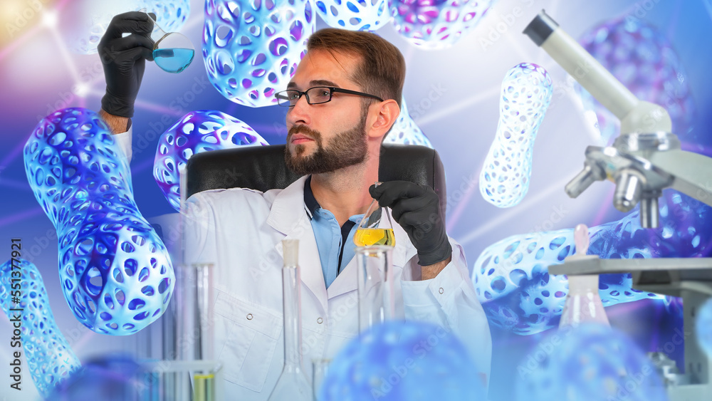 Biologist man. Laboratory assistant studies probiotic organisms. Male scientist examines liquid in test tubes. Microbiologist sits near flasks and microscope. Bacteria cells around biologist