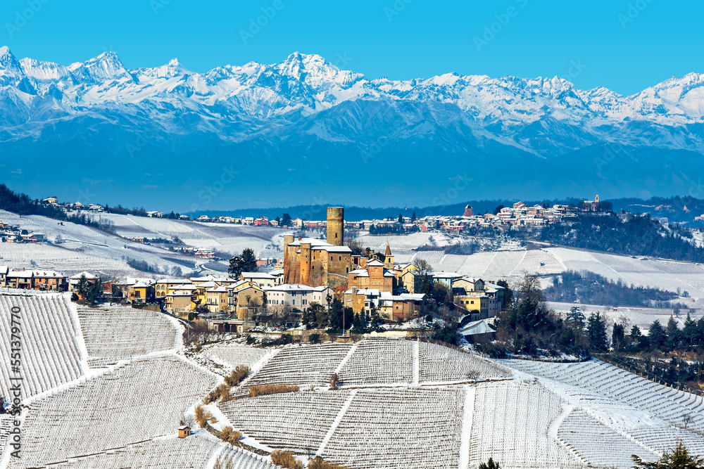 Small town on the hill covered with the snow in Piedmont, Italy.