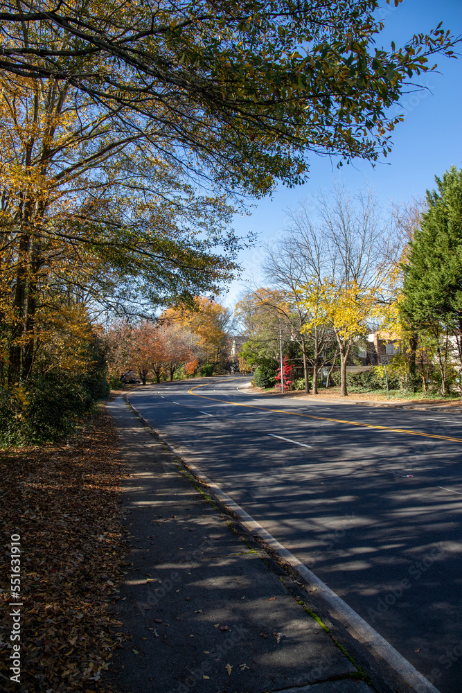 a long winding street lined with yellow and red autumn colored trees and lush green trees with fallen leaves and a clear blue sky in Decatur Georgia USA