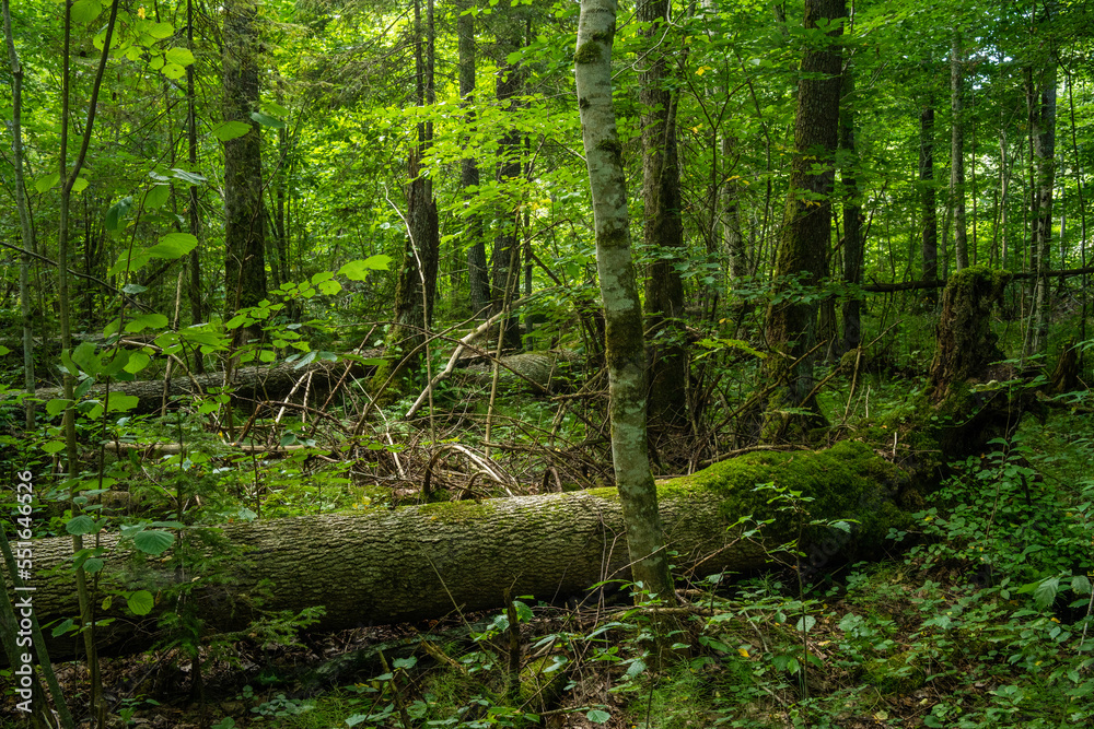 A lush old-growth deciduous forest with a lot of deadwood on a summer day in Northern Latvia