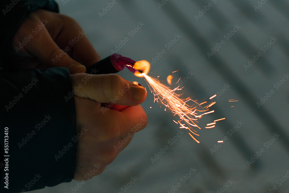 Burning Firecracker with Sparks. Guy Holding a Petard in a Hand. Loud and Dangerous New Year's Entertainment. Hooliganism with Pyrotechnics. Noise of Firecrackers in Public Places