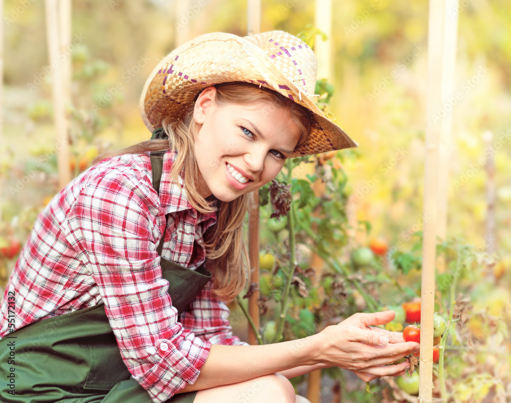 Young Caucasian gardener holding ripe vegetables in kaleyard