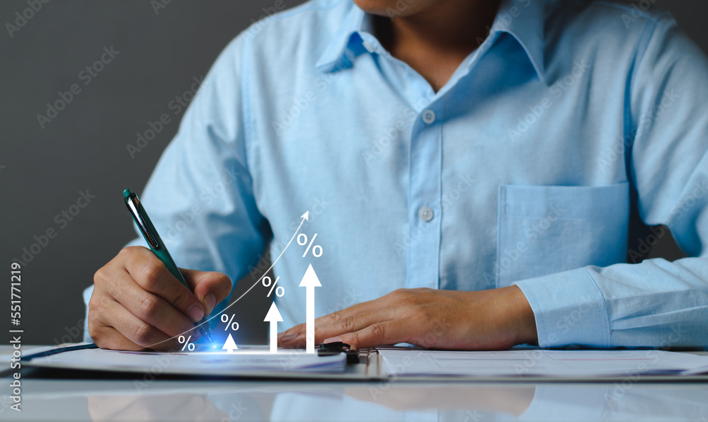 Interest rate and dividend concept. Tablet with percentage symbol and up arrow, Interest rates continue to increase, return on stocks and mutual funds, long term investment for retirement.