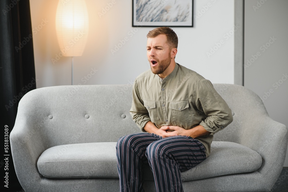 Man suffering stomach ache sitting on a couch in the living room at home.