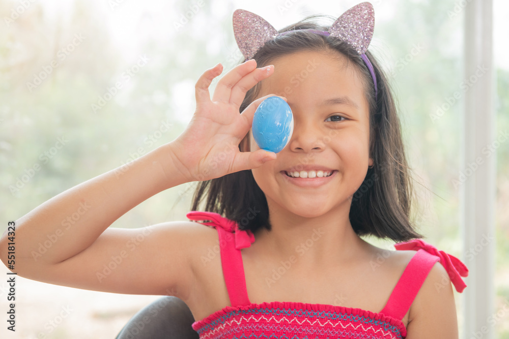 Happy easter! A beautiful child girl painting easter eggs. happy family preparing for easter. cute little child girl wearing bunny ears on easter day.