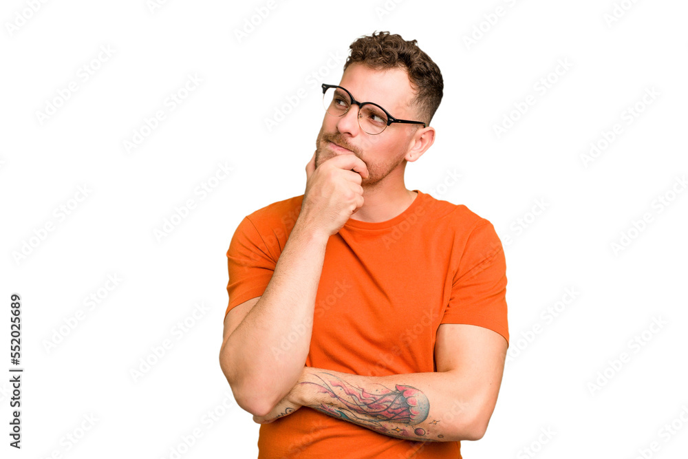 Young caucasian handsome man isolated relaxed thinking about something looking at a copy space.