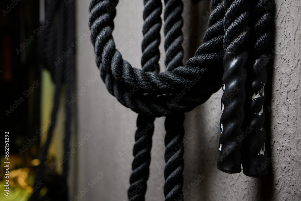 Close up of black battle rope on a gray backgound. Sport and fitness equipment. Functional training.