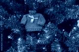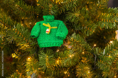 Small knitted green sweater and garlands, craft decor on branches of Christmas tree. Christmas and new year