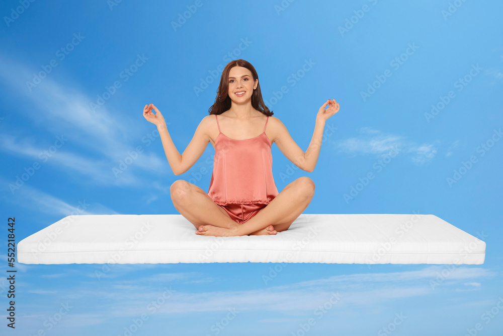 Healthy sleep. Young woman on comfortable mattress in blue sky