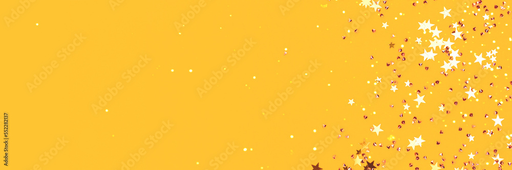 Golden stars and crystals confetti scattered on a yellow background. Festive concept with copy space. Selective focus.