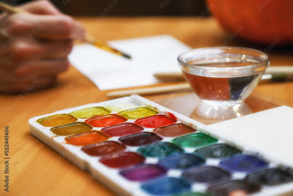 Painting as a hobby. Watercolors and water on the table and a brush in woman's hand.