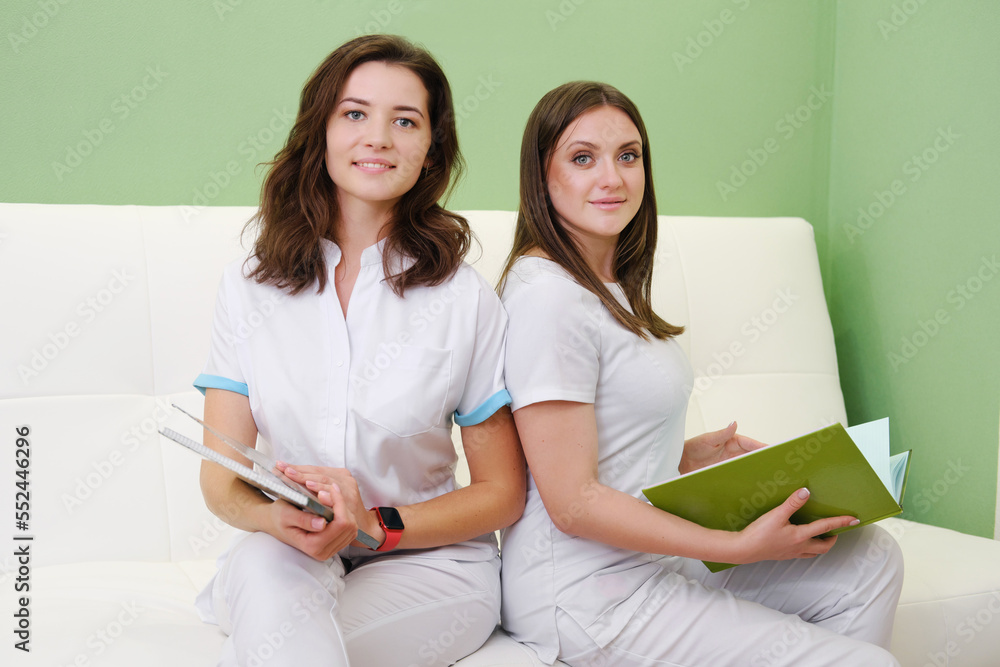 Medical workers or fellow cosmetologists in white uniforms hold notebooks in their hands, look at the camera and smile