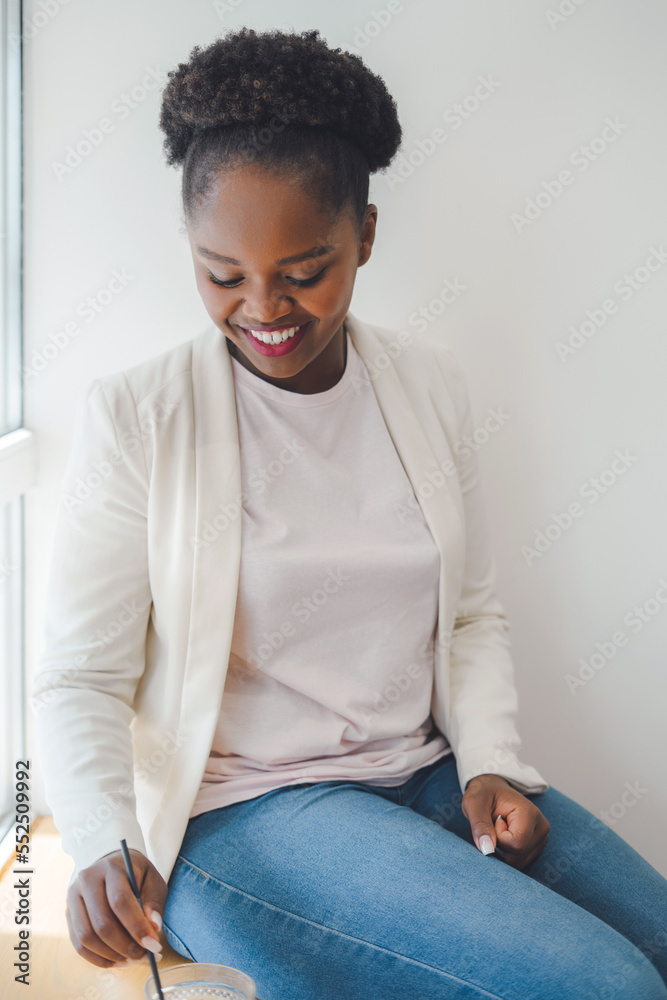 Close-up of cute afro caucasian woman drinking iced coffee, wearing white jacket spending leisure time. Sincere emotions lifestyle concept