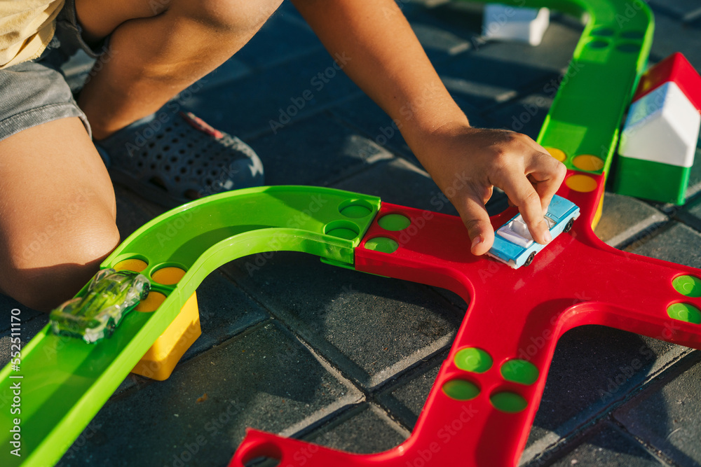 Close-up view of boys hands playing with cars in the backyard, having fun while organizing races and competitions. Educational toys. Happy family. Family