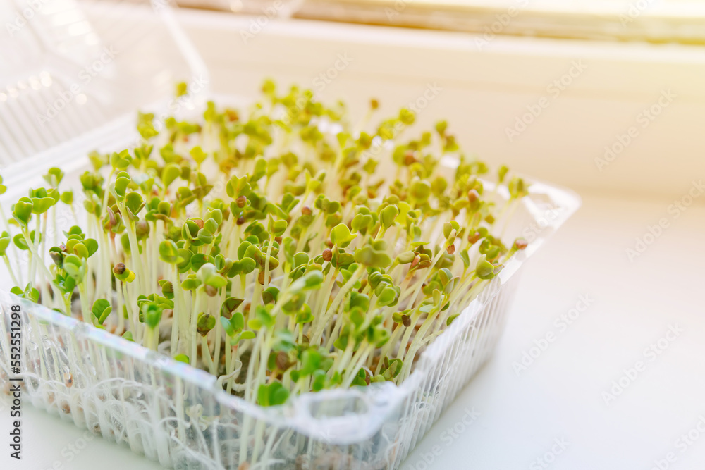 Juicy organic food micro greens radish sprouts bio organic edible harvest. Health eco gardening, ecology, home business concept.