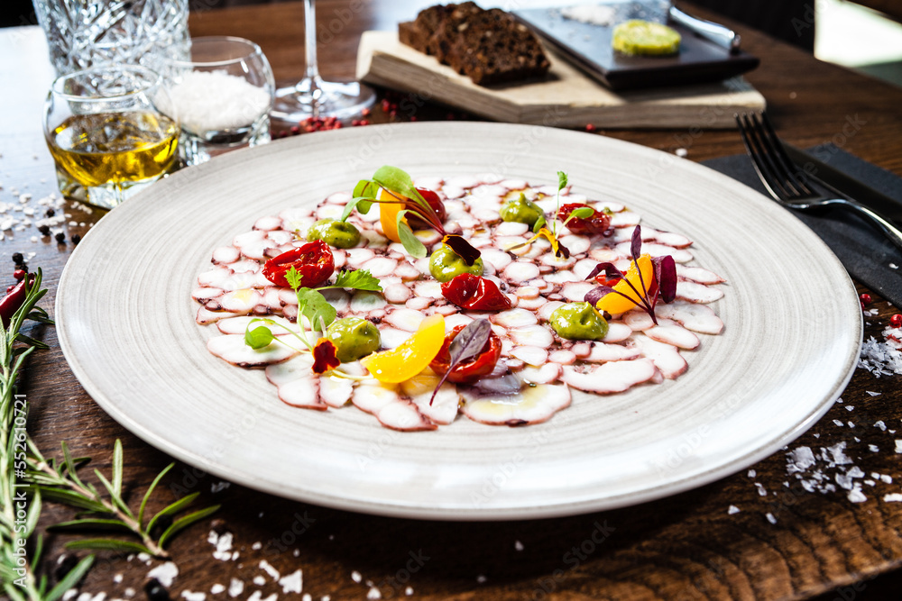 Octopus carpaccio. Spinach cream, cherry tomatoes. Delicious healthy Italian traditional food closeup served for lunch in modern gourmet cuisine restaurant