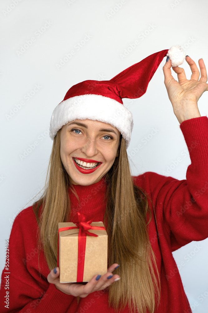 Smiling girl holding a pompom from Santa's hat in her hands.