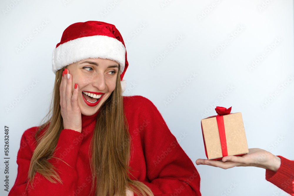 A beautiful girl in a Santa hat is happy to receive a Christmas present.