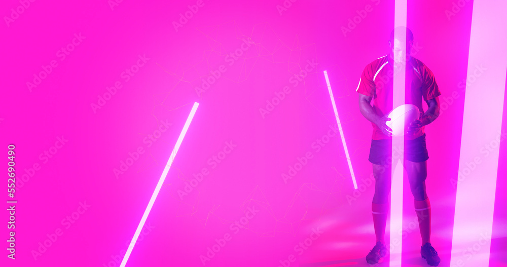 Full length of african american rugby player holding ball over illuminated lines on pink background