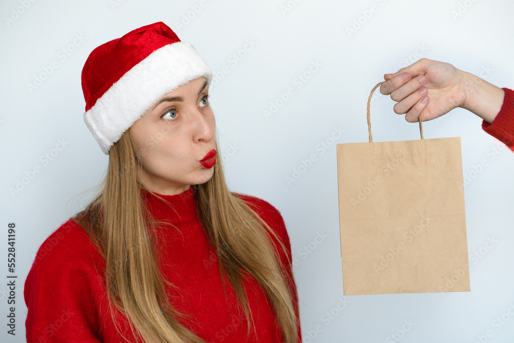 A beautiful girl dressed as Santa contemptuously looks at the gift.