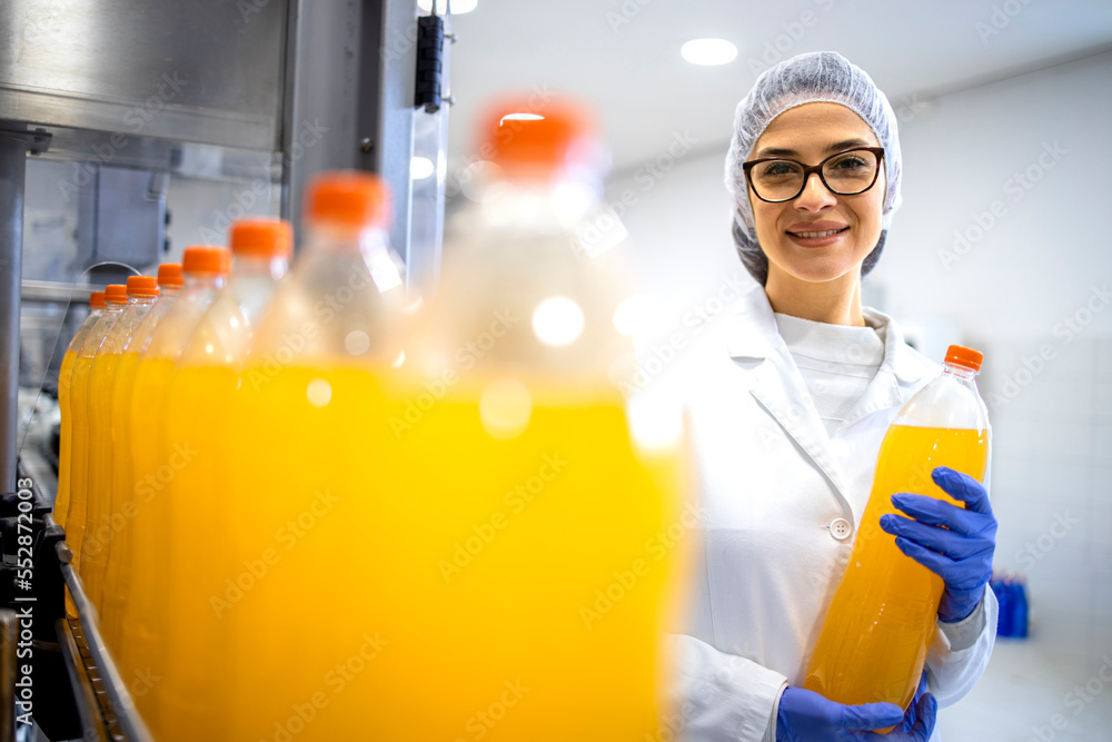 Food factory female supervisor standing in bottling plant and holding orange juice bottle.