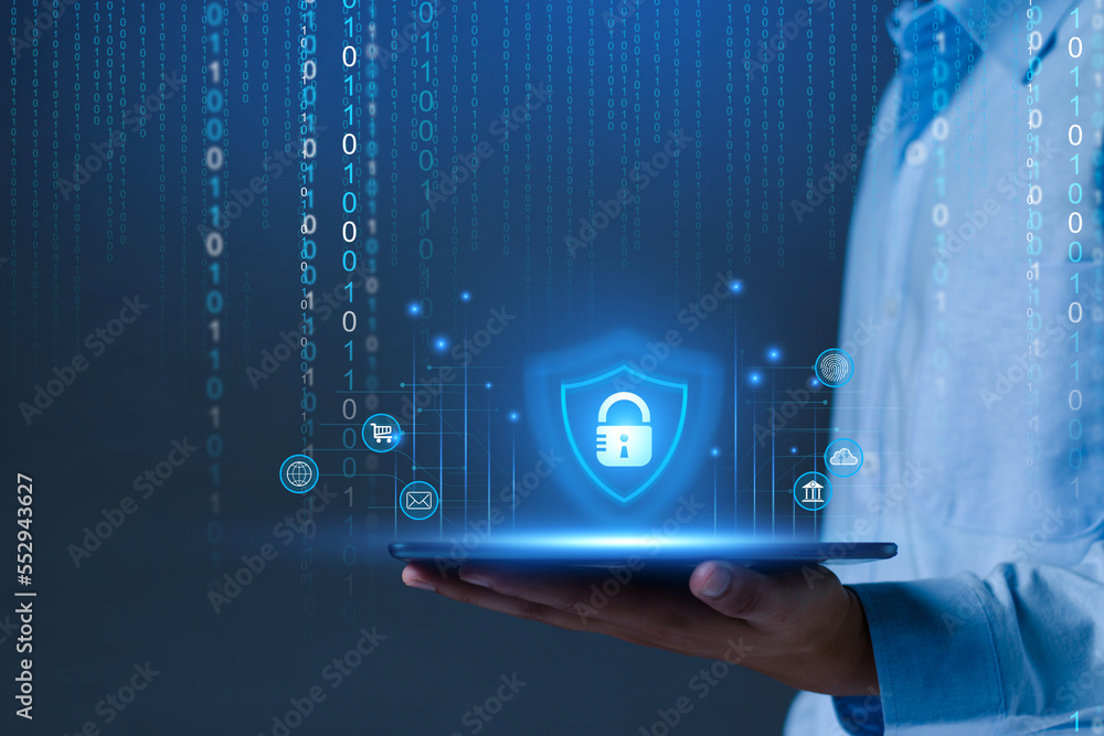Network security system. Personal Data information on Tablet. Information and cyber security Technology Services. Internet Technology. Digital data protection. Cyber Padlock security application.