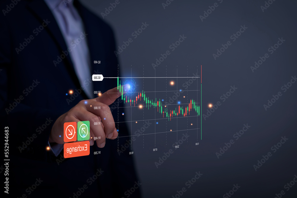planning and strategy, Stock market, Business growth, progress or success concept. Hand of Businessman or trader touching showing a growing virtual hologram stock on smartphone, invest in trading.