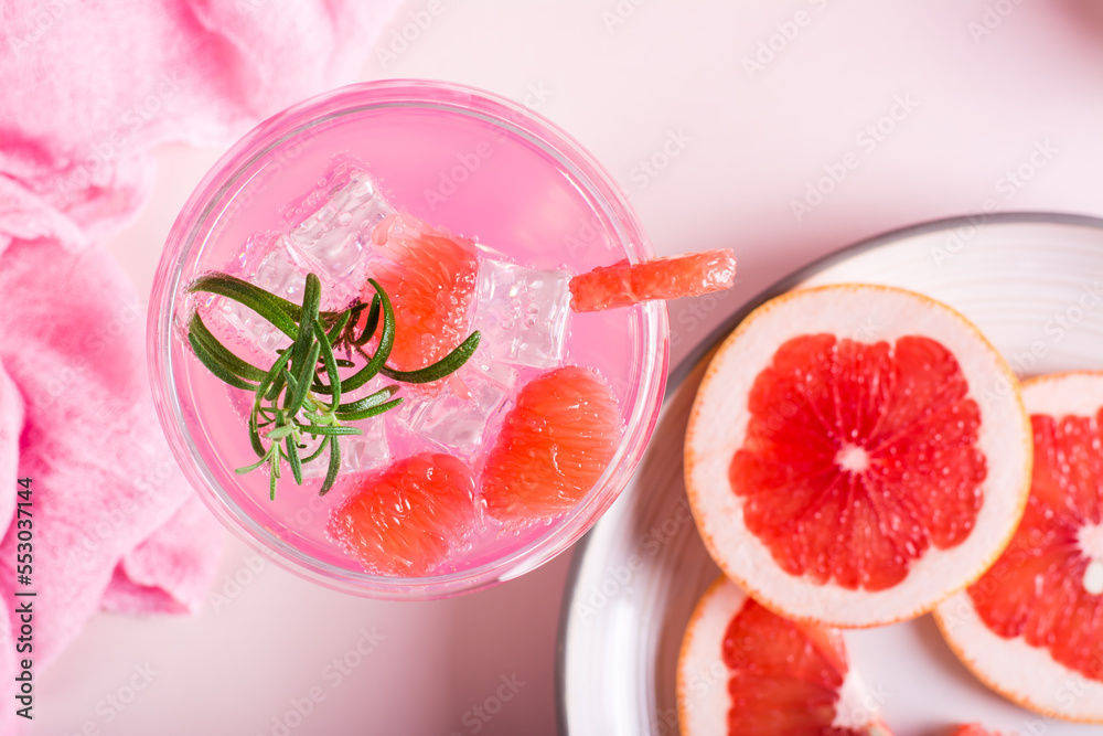 Pink cocktail with rosemary in glasses on the table. Pink food concept. Top view. Closeup