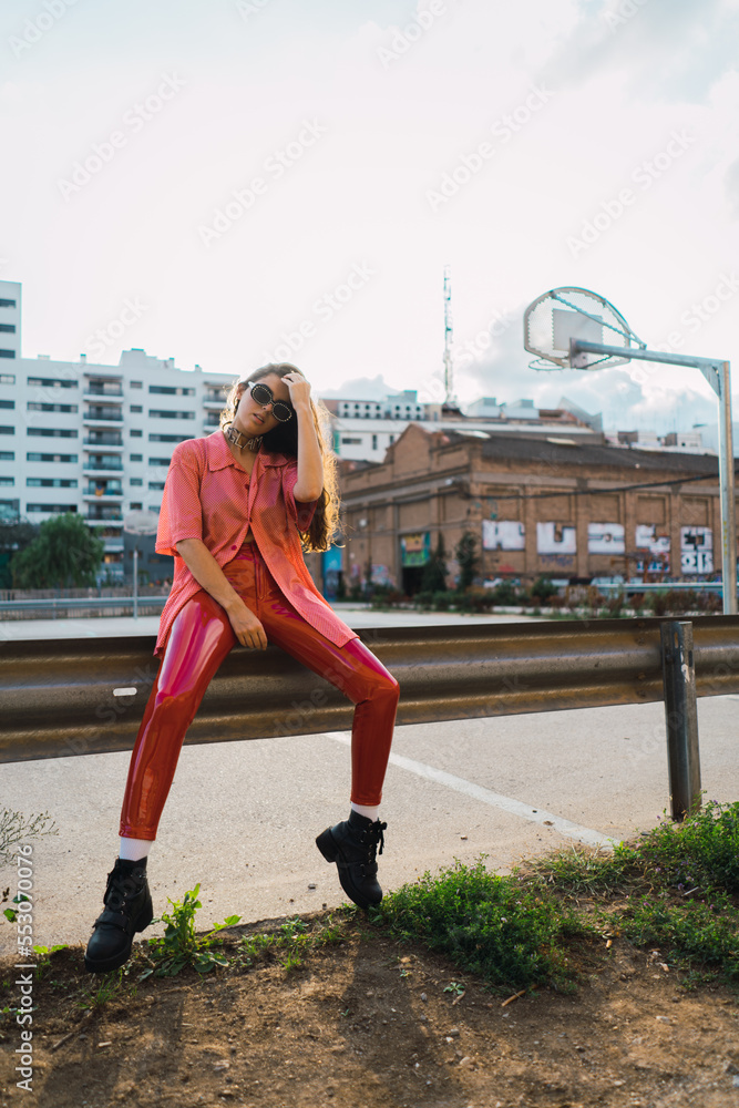 Young adult model with cool glasses and outfit posing for camera with a basketball field in the background