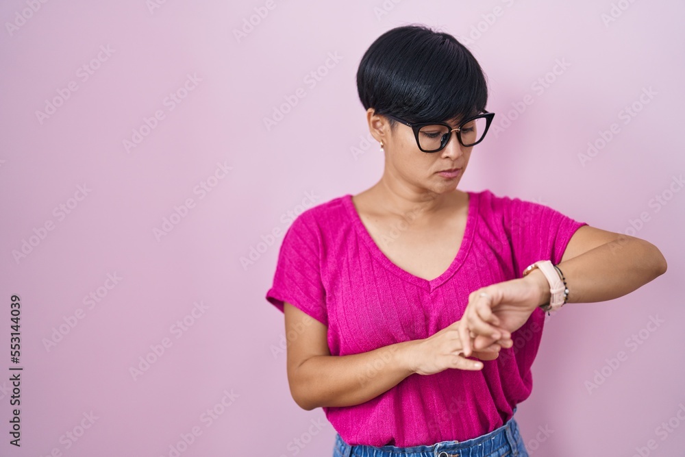 Young asian woman with short hair standing over pink background checking the time on wrist watch, relaxed and confident