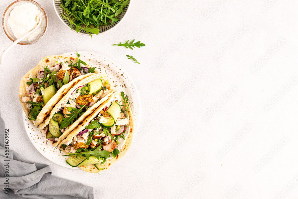Fried chicken, arugula, cucumber, radish, red onion and wheat tortilla sauce for lunch, delicious Mexican burritos or tacos. Copy space.
