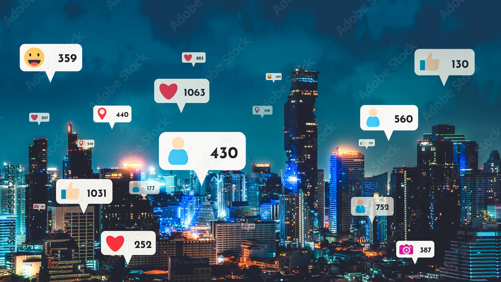 Social media icons fly over city downtown showing people reciprocity connection through social network application platform . Concept for online community and social media marketing strategy .