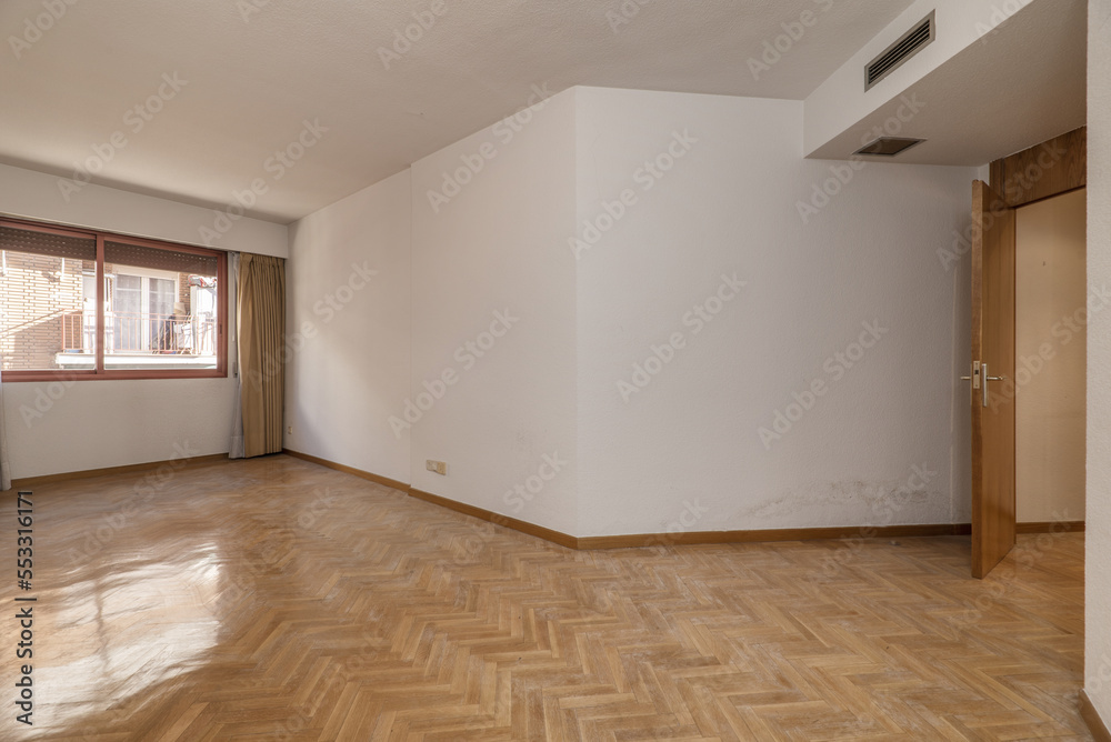 Empty room with white painted walls, French oak parquet wooden floor placed in a herringbone pattern with matching doors and skirting boards, red anodized aluminum windows