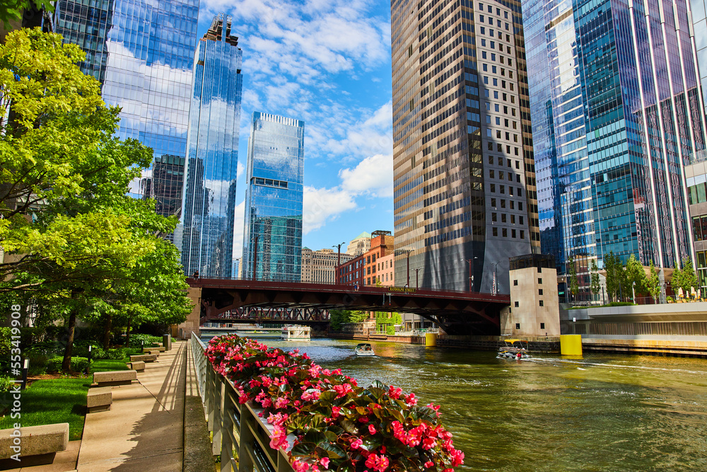 Stunning Chicago ship canal with flower beds and reflective skyscrapers of blue sky
