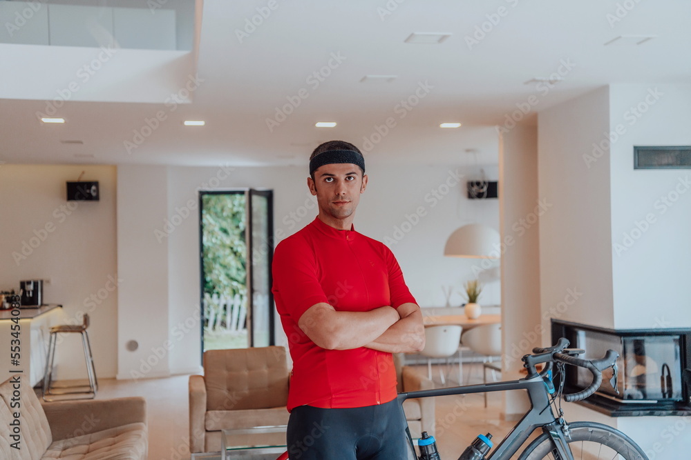 Photo of a determined triathlete standing in a modern large living room, behind him is his training bike