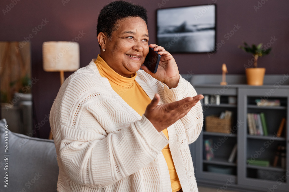 Waist up portrait of cheerful senior grandma speaking on phone in home setting and gesturing