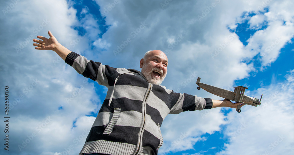 surprised senior man on sky background. senior man at retirement. senior retired man with toy plane