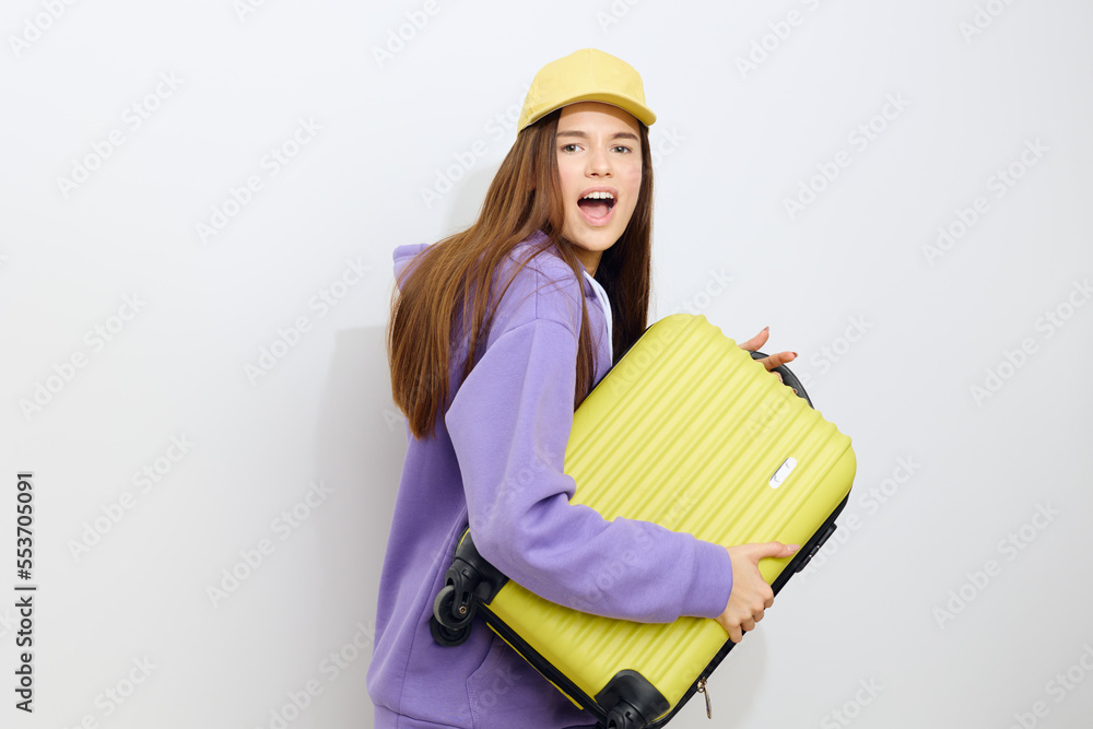a joyful woman is standing sideways on a white background in a purple tracksuit and a yellow cap, clutching a suitcase with one hand and holding it a little with the other