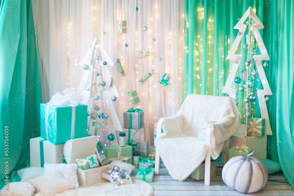 Stylish living room or studio Christmas interior in mint and tiffany colors