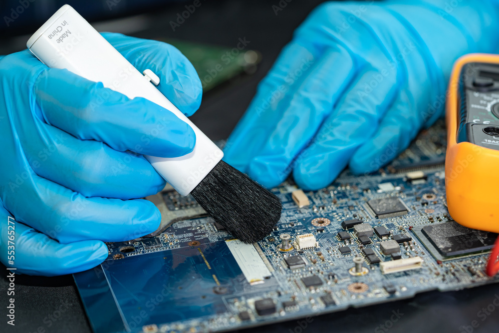 Technician use brush and air blower ball to clean dust in circuit board computer. Repair upgrade and maintenance technology.