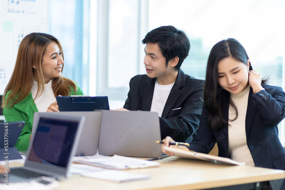 Group business people, diverse colleagues discussing and sharing ideas together the meeting room. Meeting startup entrepreneurs planning business strategies, marketing and company finance.