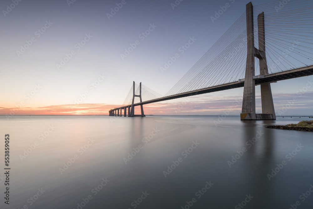 Background with colourful sunrise on the Lisbon bridge. The Vasco da Gama Bridge is a landmark, one of the longest bridges in the world. Urban landscape. Portugal is an amazing tourist destination.