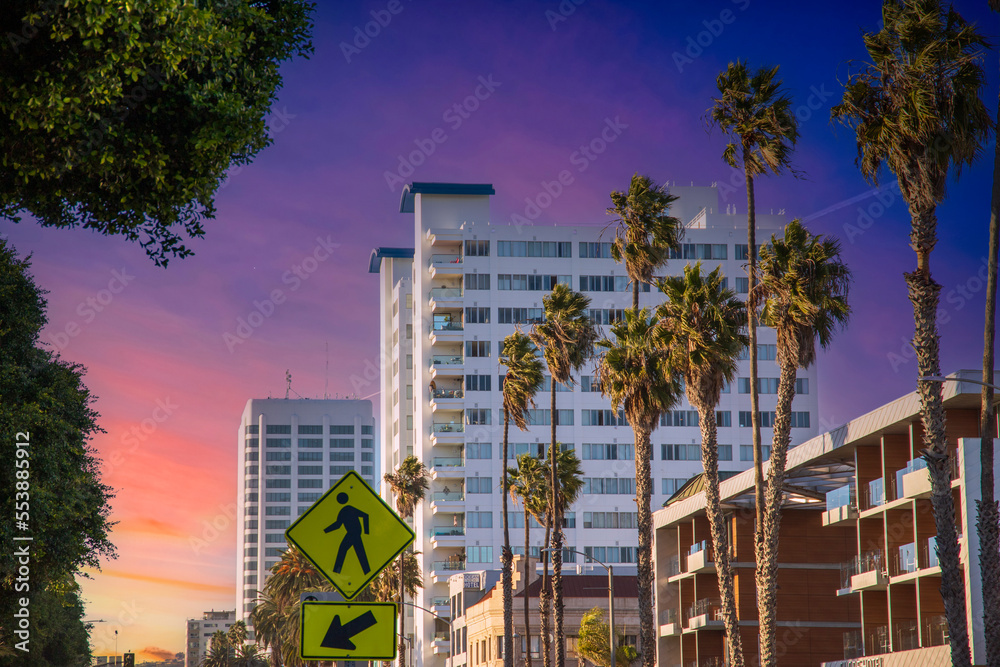 white high rise hotels and office buildings in the city skyline with tall lush green palm trees and a powerful clouds at sunset in Santa Monica California USA