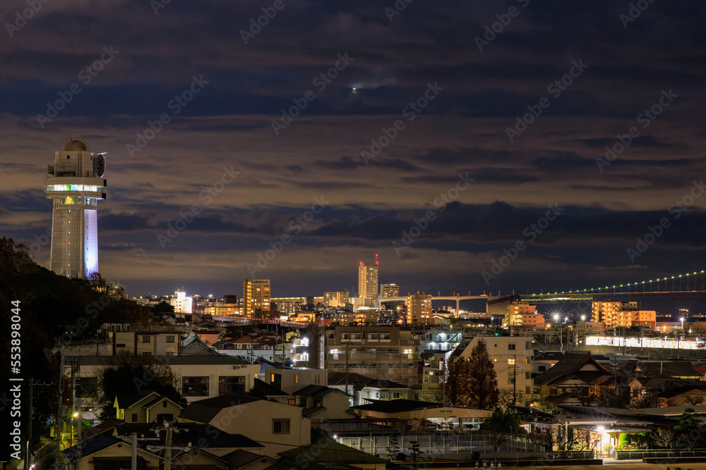 Iconic tower and dramatic sky over quiet neighborhood after sunset
