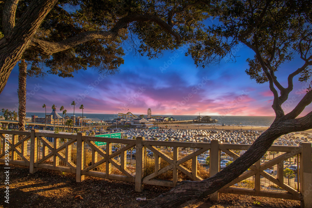 a gorgeous day at Santa Monica Pier with roller coasters, a Ferris wheel, lush green palm trees and grass, ocean water and people walking along the pier with powerful clouds at sunset in Santa Monica