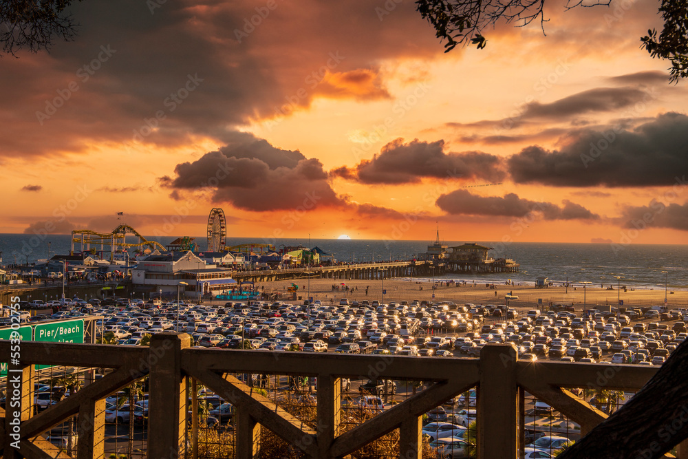 a gorgeous day at Santa Monica Pier with roller coasters, a Ferris wheel, lush green palm trees and grass, ocean water and people walking along the pier with powerful clouds at sunset in Santa Monica