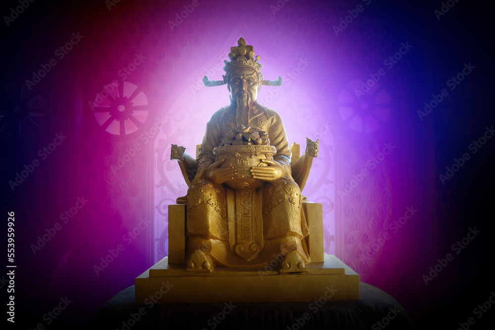 Golden Chinese god of wealth statue worshiped by devotees for wealth and good luck.