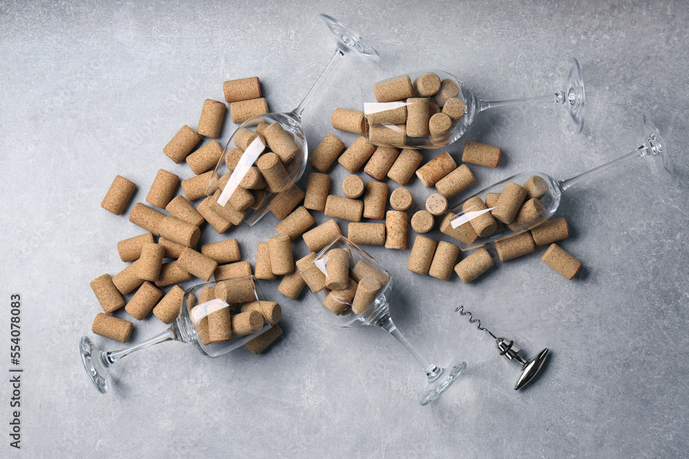 Glasses with many wine corks and corkscrew on light grey table, flat lay
