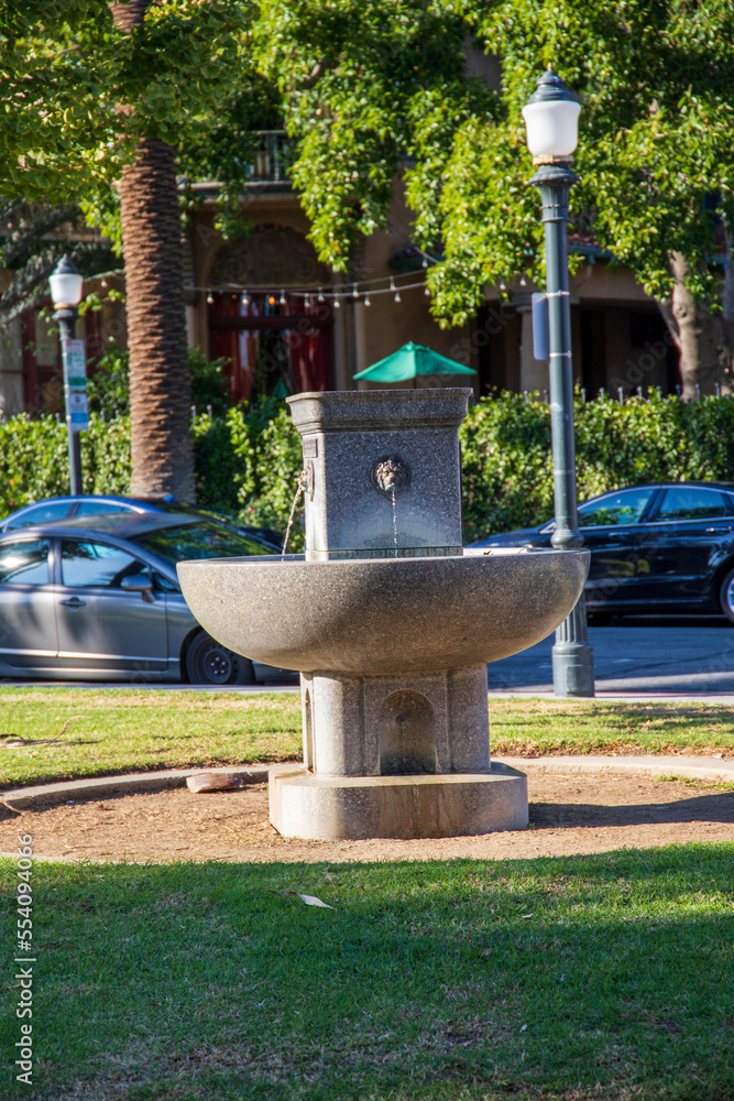 a round stone water fountain in Central Park with parked cars on the street and lush green trees, grass and plants in Pasadena California USA