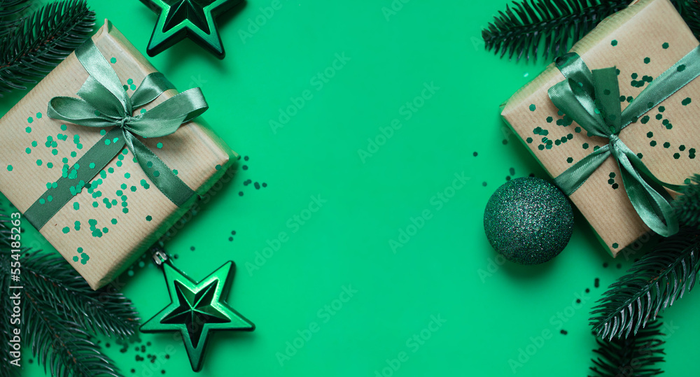 festive classic new year layout in shades of green. gift boxes in eco package with green ribbons, confetti sparkles, fir branches and christmas decorations on a green background. top view. copy space